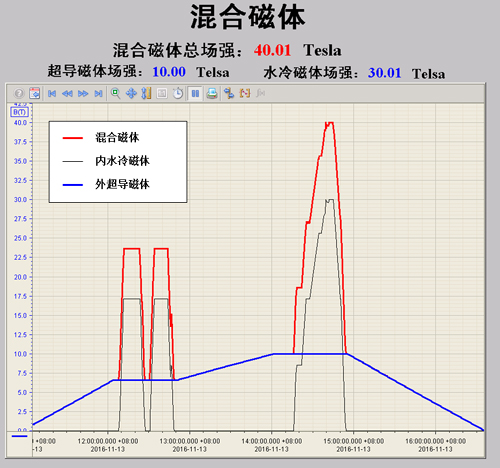 混合磁体由外超导磁体和套在其中的水冷磁体组合而成。一个月前,水冷磁体单独调试成功,能够产生30万高斯的稳态磁场;一周前,低温孔径达920毫米的大型高场超导磁体调试成功,能够产生10万高斯的稳态磁场。今天,两个磁体成功合体,共同产生了40万高斯的稳态磁场,终于圆了相关科研人员追求了八年的梦想。