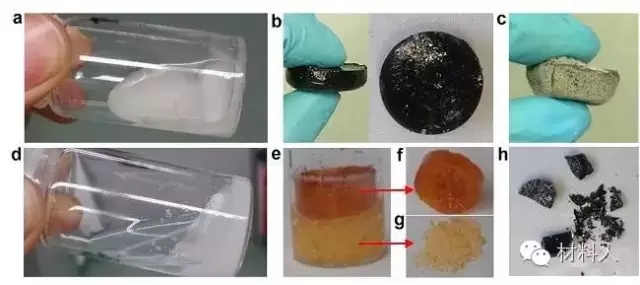 (e) 在NaCl的超盐环境下聚合后酚醛树脂,分为上下两部分;