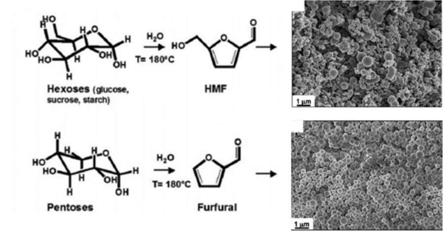 一般认为水热炭材料的生长机理有与无机晶体材料生长有类似的地方。也就是说通过有成核生长过程生成的颗粒产品。因此,水热中间体的亲疏水性质对最后产品的形貌有很大的影响。上文介绍的到,六碳糖的水热中间体是HMF,它上面的羟基使得其具有亲水性质,因此最后水热的产品是相互粘连的炭球;而对于五碳糖来说,其中间体相对比较疏水,因此在炭球成核生长的过程中,更倾向于分散的炭球。
