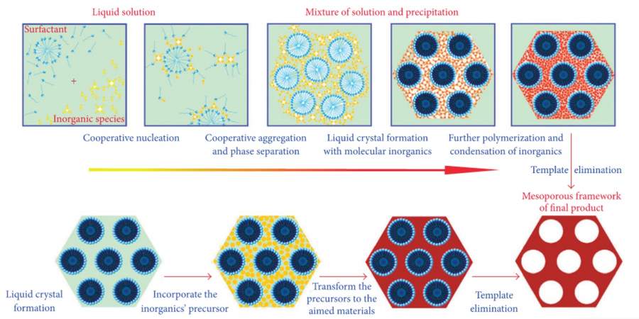 图4 一种典型的软模板法表面活性剂于前驱体自组装过程