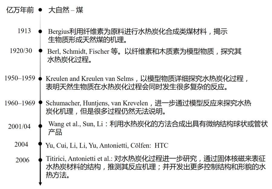 水热炭化分为高温水热炭化(> 300℃)和低温水热炭化(< 300℃)。高温水热炭化是模仿大自然中煤的生产反应。地球上的煤来源于以前的森林,由于地球表面强烈的地质运动,一部分森林被埋在很深的地底下。由于高温高压的过程,原来的森林变成了煤。早些时候,Bergius以纤维素为原料,利用水热碳化的方法来制备“类煤”的材料。(水热炭化的发展历程见图1)而低温水热反应,其温度比较温和(普通烘箱即可满足条件),对反应容器要求简单,(普通的聚四氟乙烯反应釜)在实验室应用更加的广泛。
