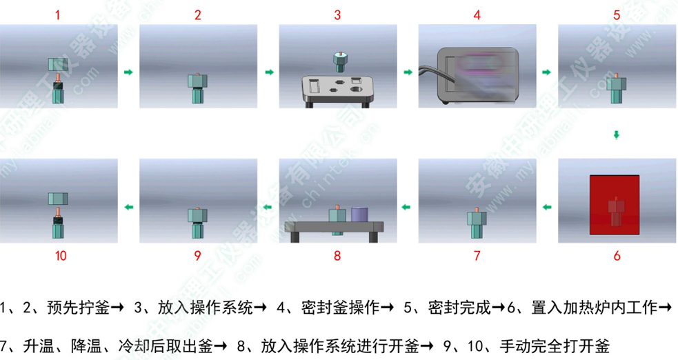 3、工作原理:三部分配件构成一个快捷有效的高压釜开关系统,能定量输出均衡的超大扭力矩,可方便、安全、可靠地进行釜的密封和打开,为水热/溶剂热合成领域科研工作提供了关键的技术装备与支持。