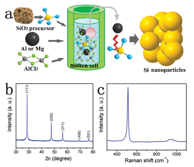 中国科学技术大学钱逸泰课题组发展了一种在200℃熔盐体系中,采用金属Al或Mg还原二氧化硅或硅酸盐制备纳米硅材料的方法。将该材料应用于锂离子电池负极材料,展示出优异的电化学性能